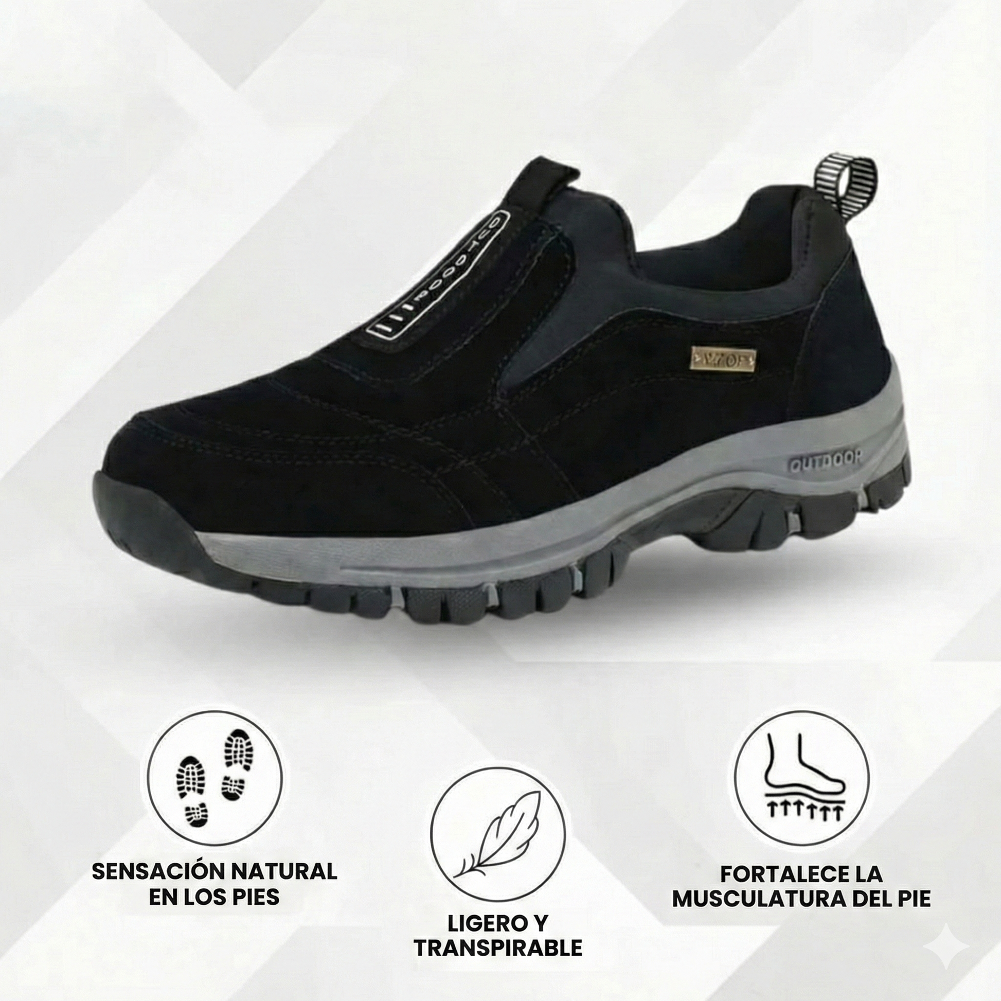 - Suela Antideslizante de Alto Agarre: Suela robusta con grip reforzado que garantiza estabilidad en cualquier superficie, desde asfalto hasta caminos de tierra.